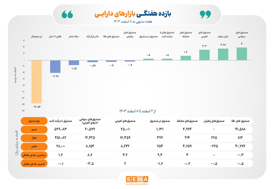 بر اساس این گزارش، در هفته نخست اسفندماه، بازده صندوقهای زعفران و طلا، به ترتیب منفی «۰.۴» و منفی «۰.۵» بود.