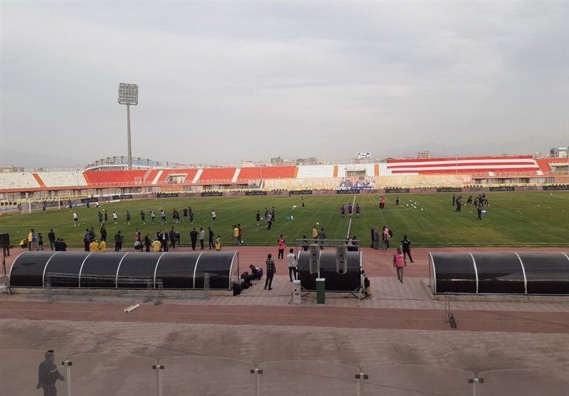 * بازیکنان هر دو تیم به نوبت وارد زمین شده تا به بررسی کیفیت زمین بپردازند.