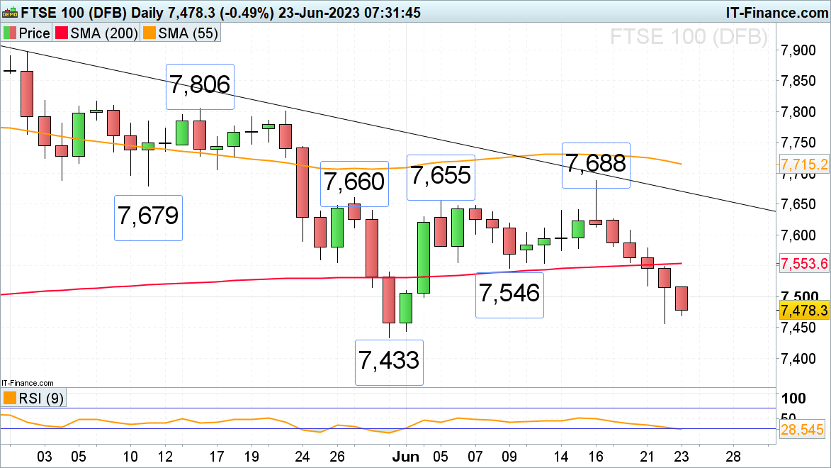 FTSE 100 برای پنجمین روز متوالی از دست دادن خود در مسیر حرکت قرار دارد. این شاخص از بالاترین سطح پنج هفته اخیر جمعه گذشته کاهش یافته است و انتظار میرود با کاهش شاخصهای آسیایی، با کاهش شاخصهای آسیایی باز شود، زیرا بانکهای مرکزی جنگطلب بر احساسات تاثیر میگذارند. پایینترین نرخ روز پنجشنبه در 7457 در دسترس است، کاهشی که از طریق آن، پایینترین سطح ماه می در 7433 را بازگرداند. نقشه.