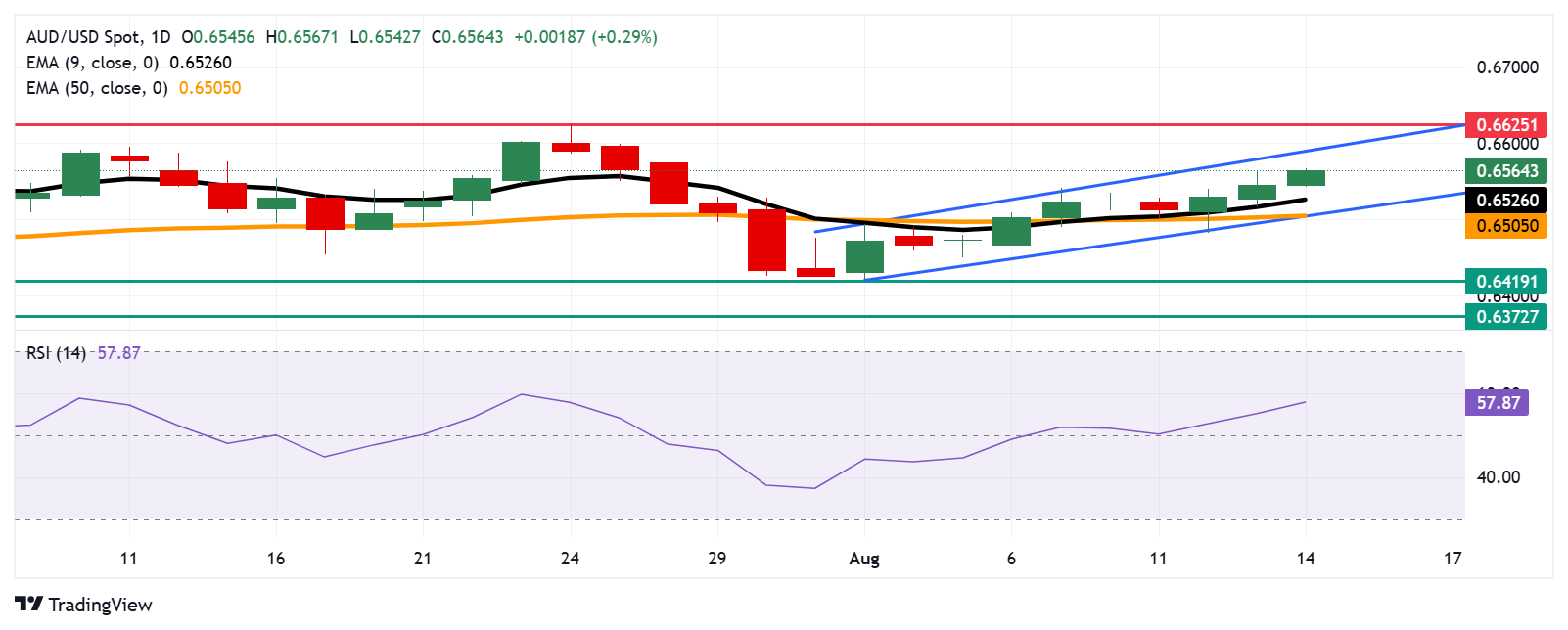 جفت AUD/USD روز پنجشنبه در حدود 0.6570 معامله می شود. تجزیه و تحلیل فنی در نمودار روزانه حاکی از تعصب مداوم صعودی است زیرا این جفت به سمت بالا در الگوی کانال صعودی حرکت می کند. این زوج بالاتر از میانگین حرکت نمایی نه روزه (EMA) باقی مانده است ، و این نشان می دهد که حرکت کوتاه مدت در حال تقویت است. علاوه بر این ، شاخص قدرت نسبی 14 روزه (RSI) بالاتر از 50 سطح حرکت کرده است و تأیید می کند که تعصب بازار صعودی است.