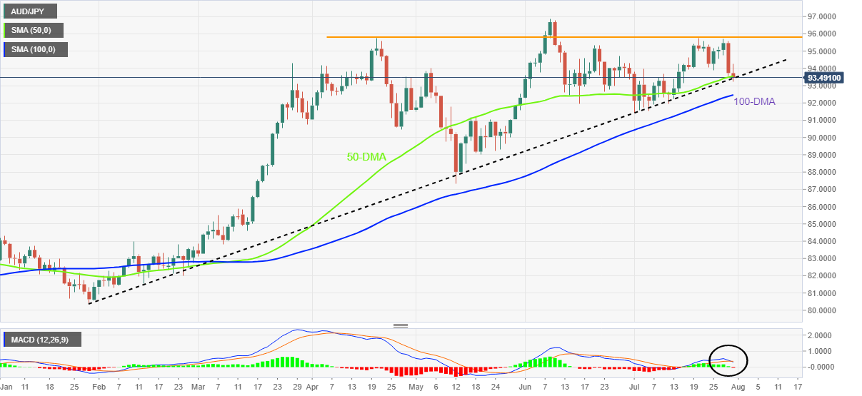 [ad_1] AUD/JPY در حدود پایین ترین حد دو هفته اخیر تحت فشار باقی می ماند و زیان روز قبل را افزایش می دهد. 50-DMA، خط روند صعودی شش ماهه، نزولی فوری را محدود می کند. MACD خرس ها را اذیت می کند اما 100-DMA به عنوان یک فیلتر اضافی به سمت جنوب عمل می کند.