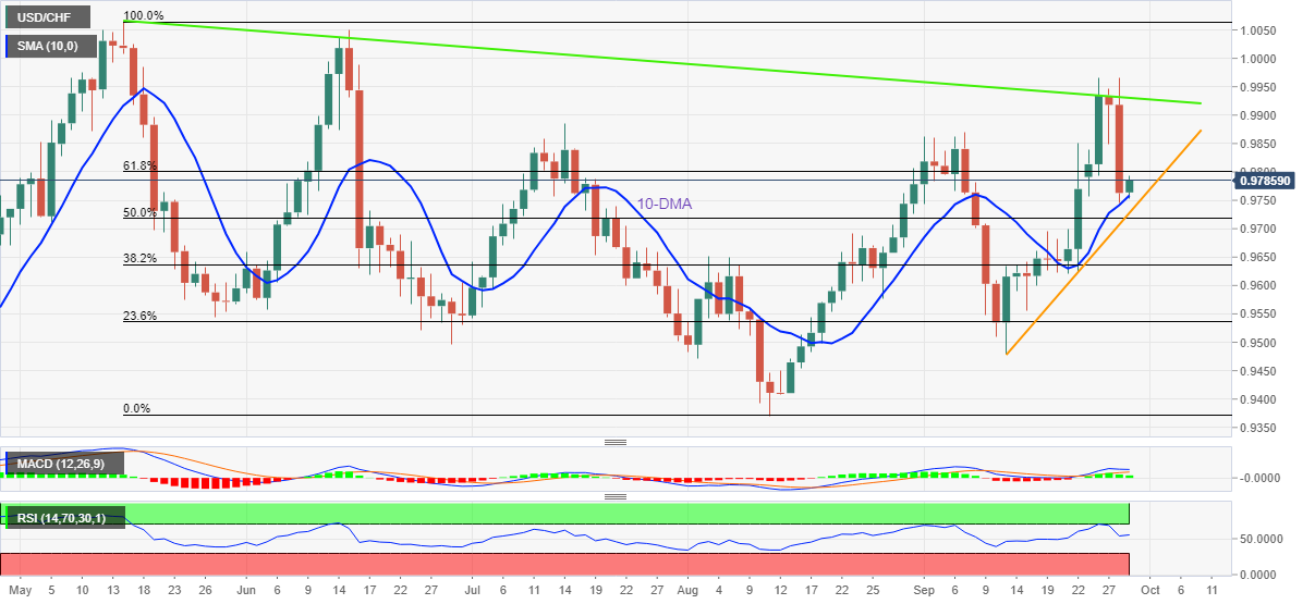 جهش پایدار این جفت از حمایت 10-DMA و RSI قوی تر، بدون خرید بیش از حد، به سیگنال های MACD صعودی می پیوندد تا خریداران را به سمت اصلاح فیبوناچی 61.8 درصدی نزولی می-اوت، نزدیک به آستانه 0.9800 هدایت کند.