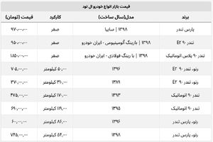 | تندر ۹۰ پلاس اتوماتیک | ۱۳۹۸ | با رینگ فولادی – ایران خودرو | صفر | ۱٬۱۵۰٬۰۰۰٬۰۰۰ |
