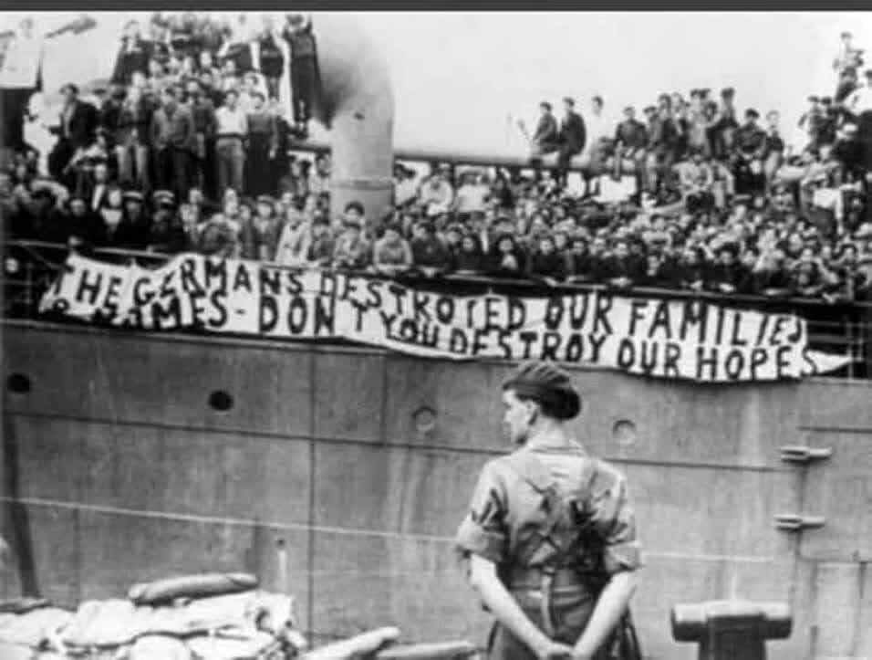به گزارش «مبلغ»- این عکس در سال (۱۹۴۷ م/۱۳۲۵ ش) در بندر حیفا واقع در شمال فلسطین گرفته شده است. در این عکس ۴۵۰۰ اخراجی یهودی پناهنده به خاکِ فلسطین، با پارچهنوشتی که بر روی عرشه کشتی نصب شده، نمایش داده شده است. در پارچه نوشته آمده است «آلمان خانه و آشیانه ما را نابود کرد، خواهشمندیم شما فلسطینیان، امید ما را نابود نکنید.»