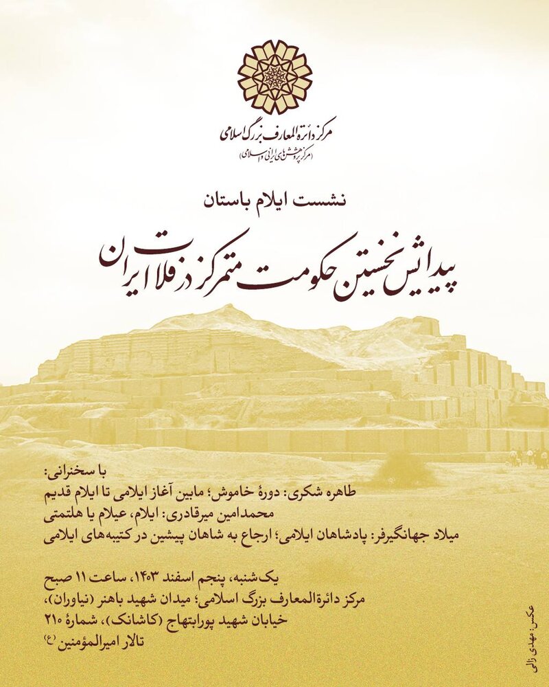 به گزارش ایسنا، بنابر اعلام روابطعمومی مرکز دائرةالمعارف بزرگ اسلامی، نشست «ایلام باستان؛ پیدایش نخستین حکومت متمرکز در فلات ایران» یکشنبه پنجم اسفندماه در این مرکز برگزار خواهد شد.