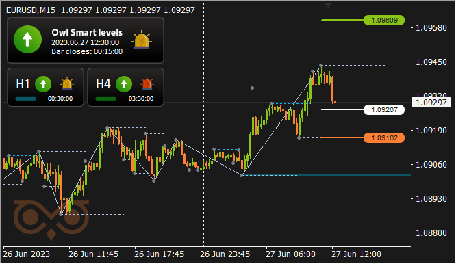 بازار روز دوشنبه در منطقه مرده قرار داشت و فرصتی به اندیکاتور نداد تا سیگنال بدهد. اولین سیگنال برای باز کردن معامله برای خرید در EURUSD توسط اندیکاتور Owl Smart Levels در روز سه شنبه در اواسط روز داده شد.