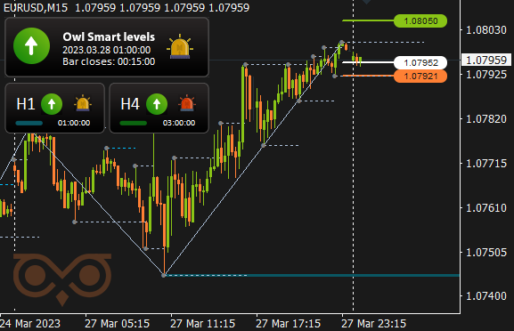 برای راحتی و دریافت به موقع سیگنال ها من از نشانگر سطوح هوشمند جغد. تایم فریم اصلی معاملات M15 است، در حالی که از تایم فریم های H1 و H4 برای تایید جهت روند تایم فریم بالاتر استفاده می شود.