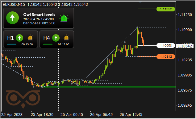 برای راحتی و دریافت به موقع سیگنال ها من از نشانگر سطوح هوشمند جغد. تایم فریم اصلی معاملات M15 است، در حالی که از تایم فریم های H1 و H4 برای تایید جهت روند تایم فریم بالاتر استفاده می شود.
