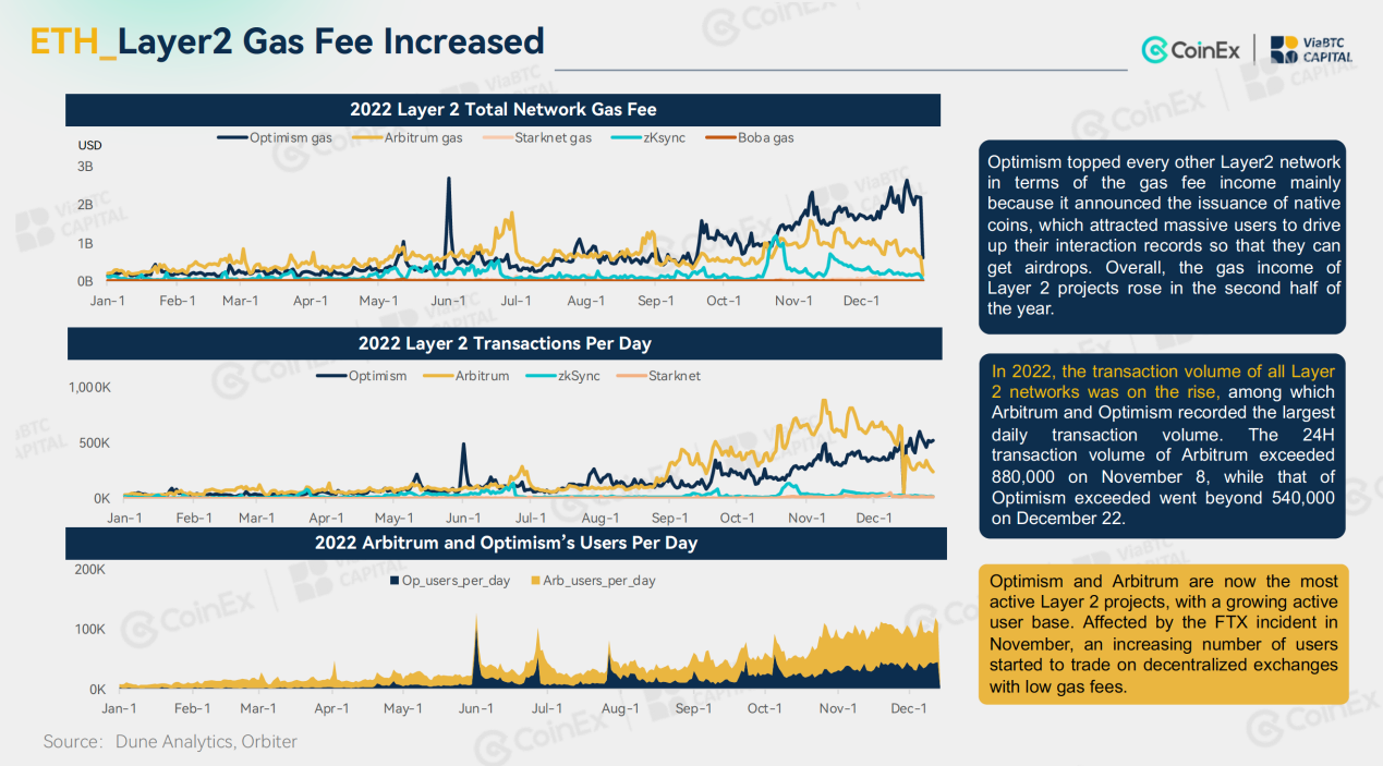 آمار اولیه اتریوم در سال 2022 روند نزولی داشت. علاوه بر قیمت بازار ثانویه و حجم تراکنش، دادههای زنجیرهای شامل TVL، هزینه تراکنش، آدرس فعال و حجم سوخت نیز کاهش یافت. با وجود آن، این شبکه در سال 2022 به پیشرفت های زیادی دست یافت. در 15 سپتامبر، اتریوم انتقال تاریخی از PoW به PoS را تکمیل کرد. ادغام به طور قابل توجهی مصرف انرژی و خروجی روزانه شبکه را کاهش داد و در نتیجه فشار دامپینگ بازارهای ثانویه را کاهش داد. در همین حال، پروژه های لایه 2 مانند Arbitrum، Optimism، zkSync و Starknet شبکه اصلی خود را به طور کامل یا جزئی راه اندازی کردند. اگرچه حجم تراکنش روزانه آنها به مراتب کمتر از شبکه اصلی اتریوم بود، اما پروژه ها از نظر تعداد آدرس ها از اتریوم پیشی گرفتند. علاوه بر این، هزینه گاز آنها به طور کلی 1/40 هزینه ای بود که توسط اتریوم دریافت می شد. در همان زمان، این شبکه همچنین شاهد افزایش تصاعدی در هزینه های گاز در طول سال 2022 بود.