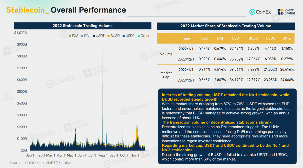 بازار استیبل کوین به طور کلی در سال 2022 باثبات بود. به طور خاص، در طول سال، عرضه استیبل کوین از 157 میلیارد دلار به 148 میلیارد دلار کاهش یافت که 6 درصد کاهش داشت. از این نظر، سقوط قابل توجهی نبود. با توجه به استیبل کوین های متمرکز، USDT تسلط خود را حفظ کرد، در حالی که BUSD در پشت بایننس به سرعت در حال رشد است. در مقابل، استیبل کوینهای الگوریتمی به شدت تحت تأثیر سقوط LUNA قرار گرفتند، که ایمان به استیبل کوینهای غیرمتمرکز را از بین برد و حجم معاملات را کاهش داد. در نتیجه، کاهش آشکاری در تعداد استیبل کوینهای غیرمتمرکز جدید وجود داشت.
