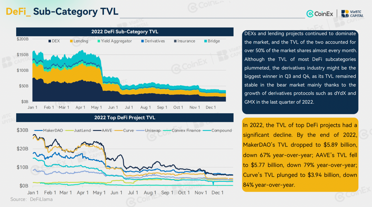 TVL DeFi نیز در سال 2022 روند نزولی داشت. به ویژه، در طول سقوط LUNA/UST در ماه می، کوین های جریان اصلی شاهد دیدنی ترین سقوط در تاریخ ارزهای دیجیتال بودند که با سقوط TVL دنبال شد. علاوه بر این، در طول سال، DeFi همچنین دچار هک های مکرر شد که نگرانی های امنیتی را برای DeFi ایجاد کرد. از نظر نوآوری، اگرچه در دو سه ماهه اول سال 2022 هر از چند گاهی شاهد تبلیغات در مورد DeFi 2.0، همراه با رکود OHM و میم (3، 3) بود، اما تقریبا ثابت شد که DeFi 2.0 یک روایت کاملاً نادرست است. و بازار توجه خود را به پروژه های زیرساختی DeFi 1.0 مانند Uniswap، Aave و MakerDAO معطوف کرد. علیرغم شرایط نزولی، پروژههای اصلی DeFi از جمله AAVE و Compound توانستند عملیات ثابت خود را حفظ کنند و بسیاری از کاربران جدید را از پروژههای CeFi خاص (مانند سلسیوس و FTX) جذب کردند.