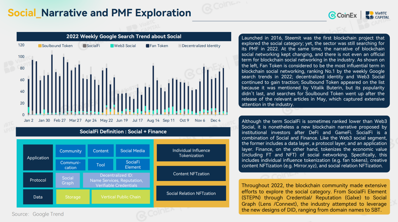 در ژانویه 2023، ViaBTC Capital و CoinEx به طور مشترک گزارش سالانه Crypto 2022 را برای ارائه تجزیه و تحلیل داده ها و بینش در 9 بخش، از جمله بیت کوین، اتریوم، استیبل کوین، NFT، زنجیره های عمومی، DeFi، SocialFi، GameFi و سیاست های نظارتی منتشر کردند. این گزارش همچنین روند کریپتو در سال 2023 را پیش بینی می کند.