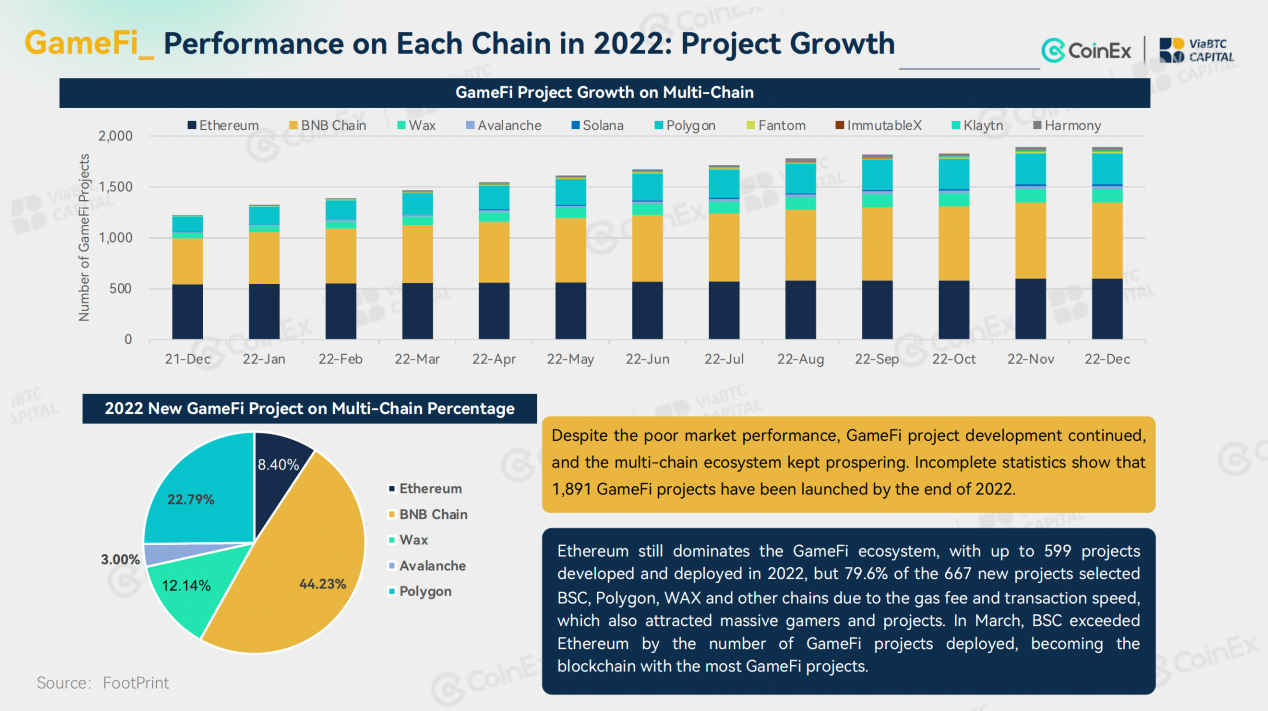 2022 همچنین آغاز خرس GameFi بود. هیچ نوآوری قابل توجهی در مدل بازی بلاک چین P2E وجود نداشت. با کاهش رشد کاربران و حجم معاملات، سرمایه گذاران نهادی از مدل P2E چشم پوشی کردند. در نیمه اول سال، مدل Move-2-Earn که توسط STEPN ایجاد شد، با توکنومیک دوگانه و رویکرد بازاریابی نوآورانه، توجه را به خود جلب کرد و پویایی جدیدی را به GameFi آورد. سال گذشته، پروژههای بلاک چین بیشترین سرمایه را در آوریل به دست آوردند که مجموعاً ۶.۶۲ میلیارد دلار سرمایهگذاری در بلاک چین داشت. با این حال، بازار به سایر تیم های پروژه که بر روی مدل واقعیت به علاوه توکن تمرکز داشتند، پاسخ نداد. با افزایش محبوبیت اکوسیستم چند زنجیره ای، اتریوم تسلط خود را در اکوسیستم GameFi حفظ کرد، اما نرخ رشد پروژه های اتریوم با نرخ رشد BNB Chain و Polygon مطابقت نداشت. علاوه بر این، بیشتر زنجیرهها بهشدت به پروژههای برتر خود متکی بودند و هنوز تعداد زیادی پروژههای GameFi با کیفیت پایین با پایگاه کاربر کوچک، تعاملات پایینتر و حجم معاملات کم وجود داشت.