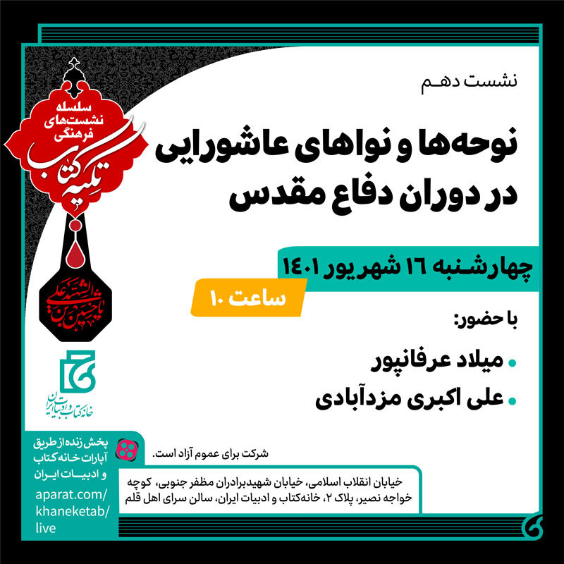 نشست «نوحه‌ها و نواهای عاشورایی در دوران دفاع مقدس»، ساعت ۱۰ روز چهارشنبه (شانزدهم شهریورماه ۱۴۰۱) در خانه کتاب و ادبیات ایران به نشانی خیابان انقلاب اسلامی، خیابان شهید برادران مظفرجنوبی، کوچه خواجه نصیر، پلاک دو، سرای اهل قلم برگزار و به‌صورت زنده از آپارات به نشانی aparat.com/khaneketab/live پخش می‌شود.