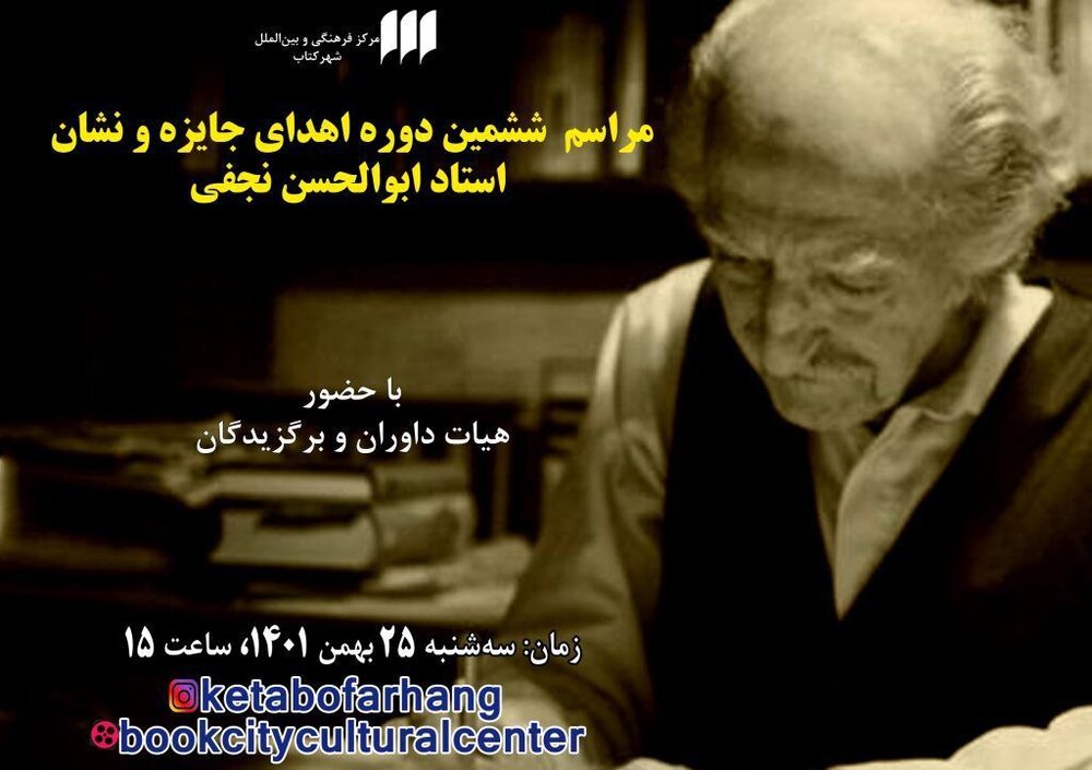 به گزارش خبرگزاری خبرآنلاین، به مناسبت پاسداشت مقام علمی و فرهنگی ابوالحسن نجفی و تشویق نسل جوان در انتخاب آثار برای ترجمه و توجه به درست‌اندیشی و درست‌نویسی، مراسم اهدای ششمین دوره‌ی جایزه و نشان «ابوالحسن نجفی» با حضور هیات داوران و برگزیدگان این جایزه سه‌شنبه ۲۵ بهمن ساعت ۱۵ در مرکز فرهنگی شهر کتاب به صورت مجازی برگزار می‌شود.