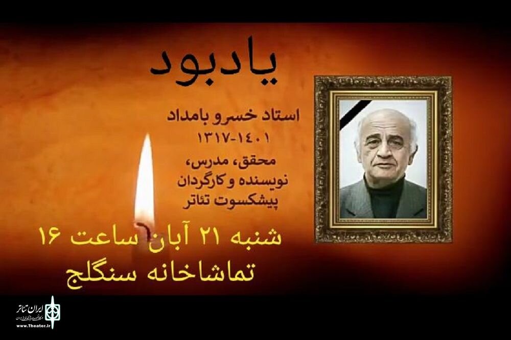 به گزارش خبرگزاری خبرآنلاین به نقل از روابط عمومی اداره کل هنرهای نمایشی، مراسم یادبود زندهیاد خسرو بامداد مدرس، محقق، نویسنده و کارگردان پیشکسوت تئاتر روز شنبه ۲۱ آبان ماه، ساعت ۱۶ با حضور هنرمندان و دانشجویان این هنرمند در تماشاخانه سنگلج برگزار خواهد شد.