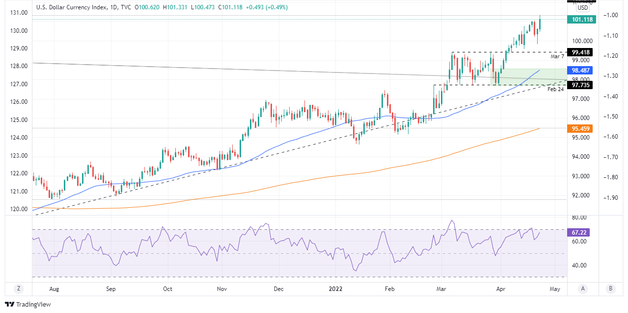 [ad_1] شاخص دلار آمریکا (DXY)، با توجه به اظهارات مقامات فدرال رزرو به بالاترین حد خود در 25 ماه گذشته رسید. سخنرانان فدرال رزرو در هفته از افزایش 50 بیتی بر ثانیه نرخ بهره در نشست 4 تا 5 می حمایت می کنند. پیش بینی قیمت شاخص دلار آمریکا (DXY): گاوها بالاترین قیمت ژانویه 2017