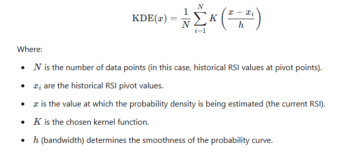 ساختن توزیع احتمال: پس از انتخاب هسته و پهنای باند، KDE بر روی مجموعه مقادیر محوری RSI اعمال می شود. نتیجه یک توزیع احتمال پیوسته است که نشان میدهد چقدر احتمال دارد RSI فعلی نزدیک به سطوح محوری مهم تاریخی باشد.