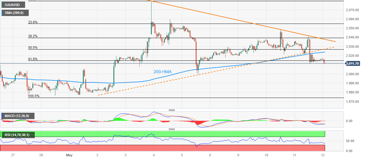 قیمت طلا همچنان نزولی است و در عین حال شکست یک مثلث متقارن یک هفته ای و میانگین متحرک 200 ساعته (HMA) را توجیه می کند. به غیر از 200-HMA و قیمت پایین مثلث اعلام شده، به ترتیب نزدیک به 2024 دلار و 2027 دلار، سیگنال های MACD نزولی و RSI نزولی که بیش از حد فروش نشده اند، نیز زمینه ساز تعصب نزولی در مورد قیمت طلا هستند.