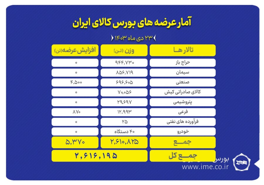 تالار حراج باز هم میزبان عرضه ۸۰۵ کنسانتره سنگ آهن، ۱۰۸ هزار و ۵۰۰ تن وکیوم باتوم، ۲۵ هزار تن سنگ آهن دانه بندی ۳ هزار تن سولفات سدیم، ۳ هزار تن مس کاتد و ۲۳۰ تن سولفور مولیبدن است.