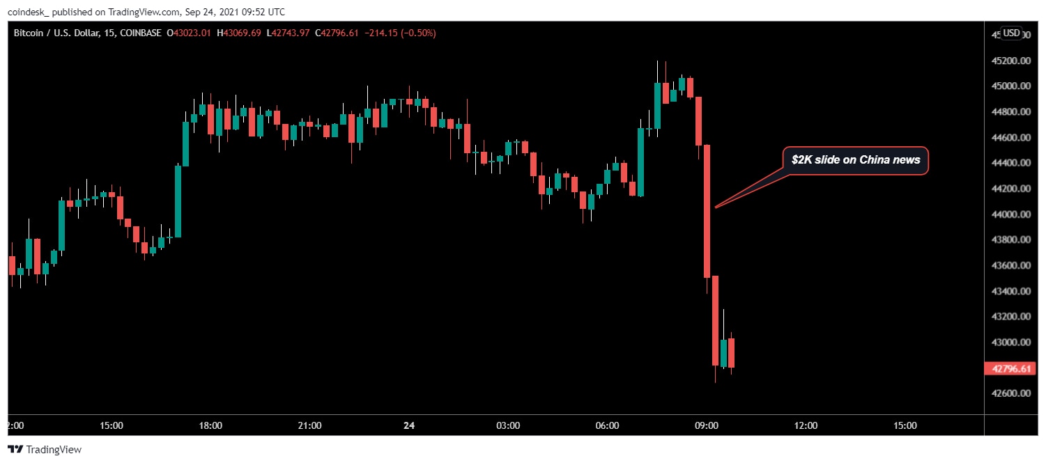 بیت کوین 2 هزار دلار کاهش یافت زیرا چین کسب و کارهای مرتبط با ارزهای دیجیتال را غیرقانونی اعلام کرد-CoinDesk