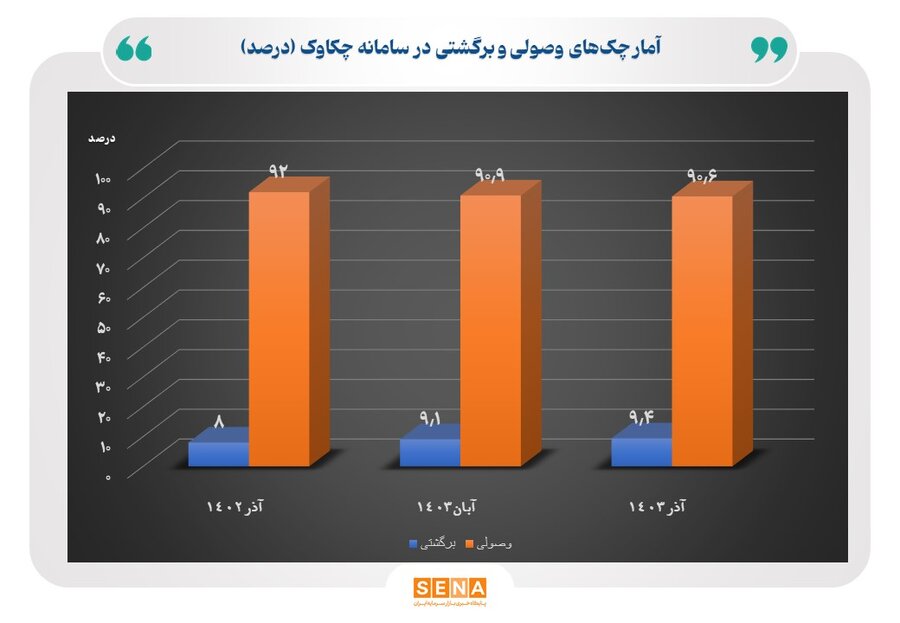 براساس اطلاعات سامانه انتقال تصویر چک (چکاوک)، در آذر ماه سال جاری، نسبت تعداد چکهای وصولی به مبادلهای، ۹۰.۶ درصد و نسبت مبلغ چک های وصولی به مبادلهای ۸۶ درصد بوده است.