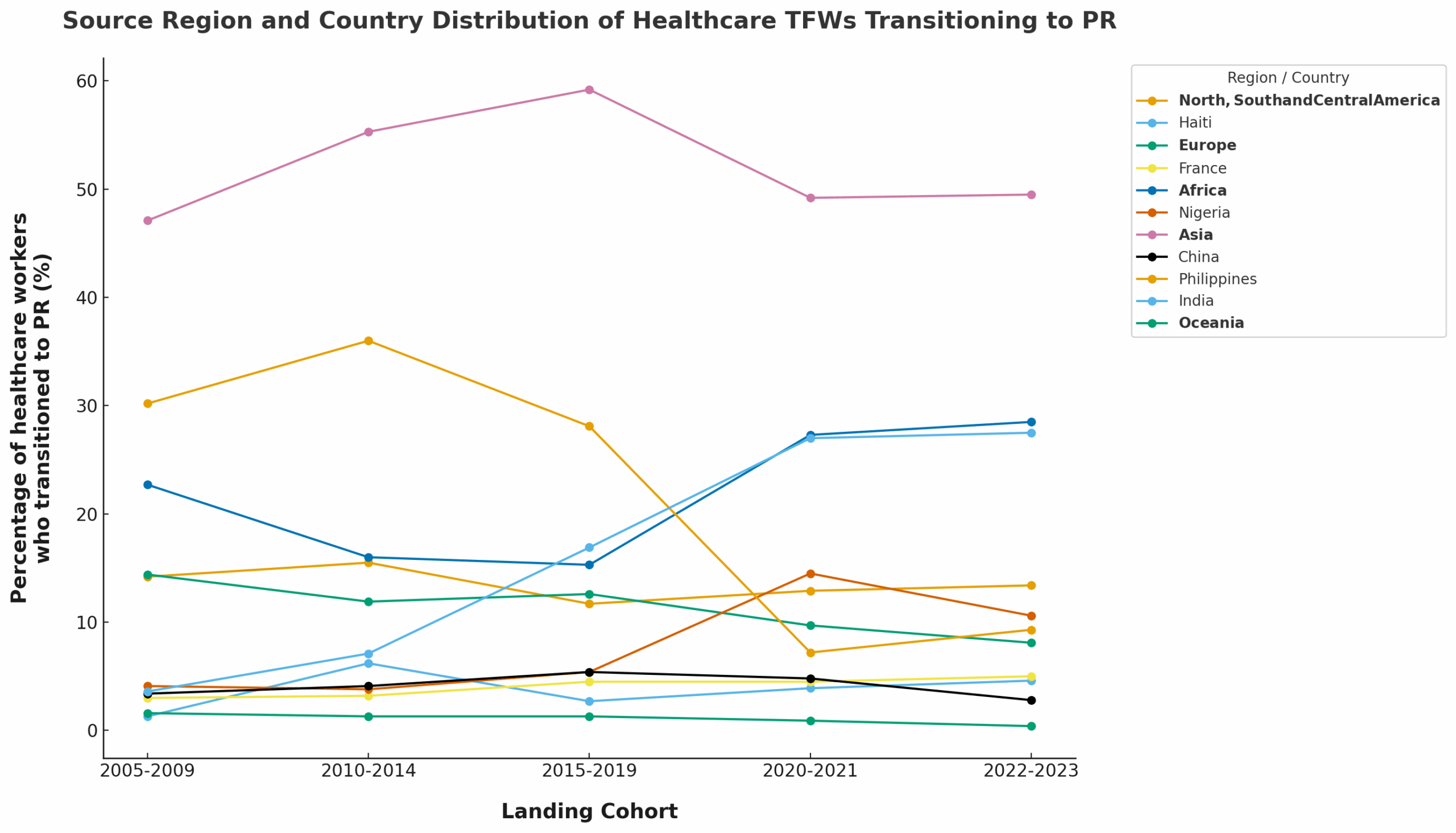 بین سالهای 2000 تا 2022 ، 105،000 کارگر بهداشت و درمان از محل اقامت موقت به دائمی در کانادا منتقل شدند.