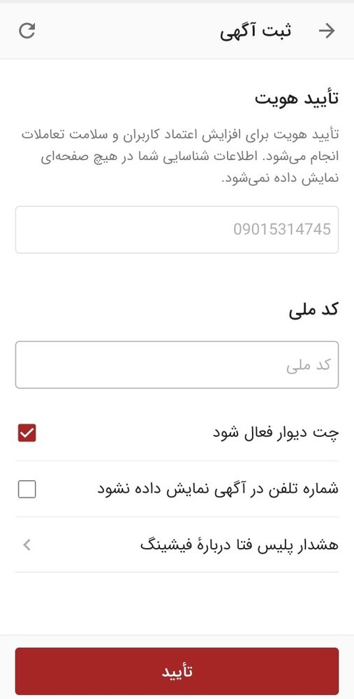کد ملی شما با حفظ محرمانگی برای تایید هویت و تطبیق با شمارهٔ موبایلتان نیاز است. کد ملی شما به همراه شمارهٔ موبایل از سامانهٔ شاهکار استعلام و در صورت تطبیق آن با کد ملی مالک شمارهٔ موبایل، تأیید هویت انجام می‌شود. کد ملی فقط برای تایید هویت افراد دریافت می‌شود و در هیچ صفحه‌ای نمایش داده نمی‌شود.