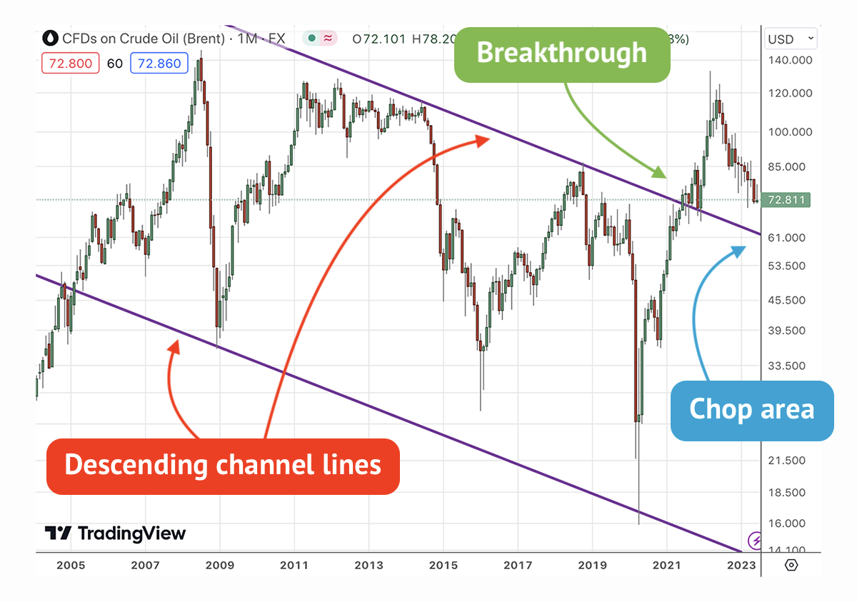 ما الان چی داریم؟ کاهش قیمت نفت. منطقی نیست! البته می توان گفت که ارتش های میلیونی سرباز در سراسر قاره حرکت نمی کنند و در حال حاضر سوخت زیادی مورد نیاز نیست. بعلاوه، یک تحلیلگر بنیادی ممکن است بگوید که بازار در شرایط انجماد احتمالی درگیری قیمت گذاری می کند. اما همه اینها فقط صحبت است. حال ببینید تحلیل تکنیکال چگونه به این سوال پاسخ می دهد. در اینجا نمودار قیمت لگاریتمی برنت آمده است. بازه زمانی ماهانه است.