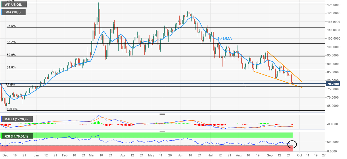 [ad_1] WTI همچنان در حدود پایینترین سطح از ژانویه 2022 تحت فشار است و این ضعف روز جمعه را حفظ میکند. خط حمایت شش هفتهای، اصلاح فیبوناچی 78.6 درصد میتواند خرسها را در میان RSI بیش از حد فروش آزمایش کند. خریداران برای بازپس گیری کنترل نیاز به اعتبارسنجی از سقوط گوه دارند. WTI در