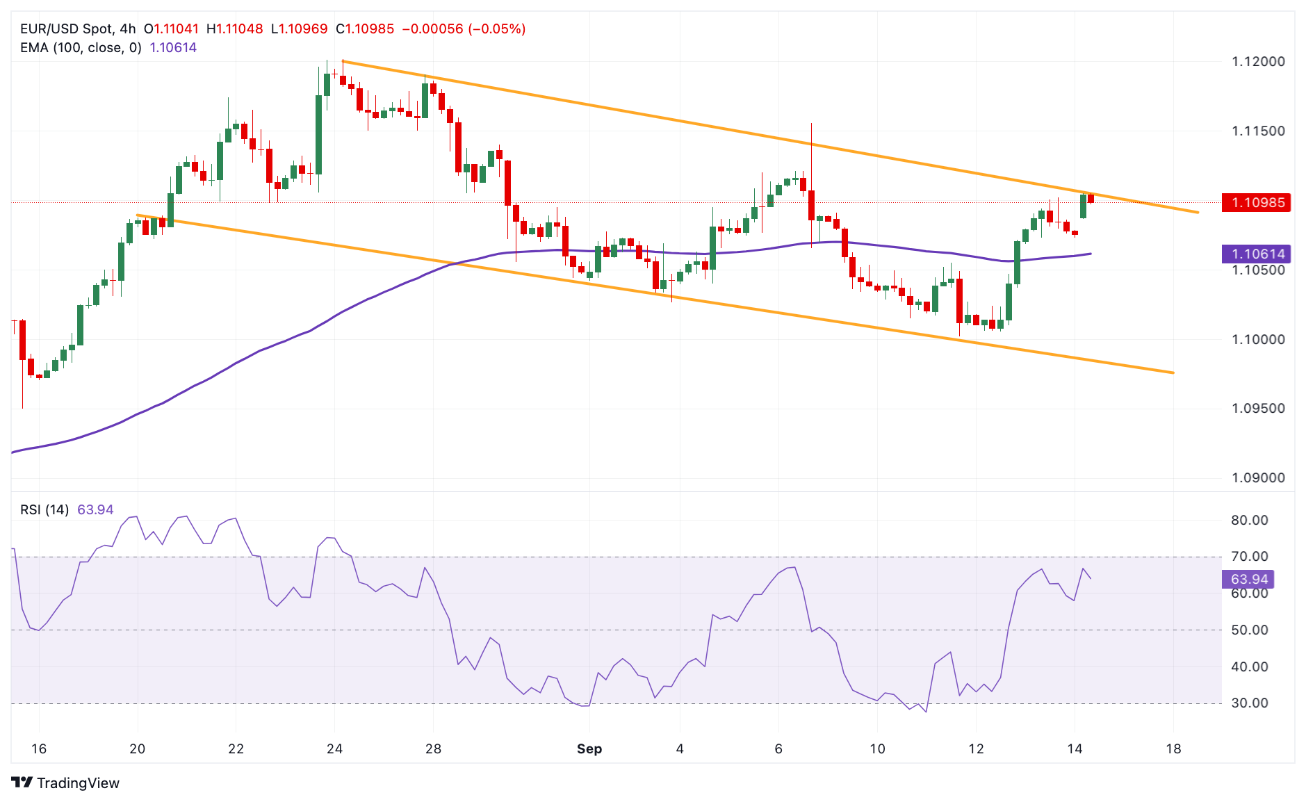 EUR/USD در نمودار چهار ساعته زیر کانال روند نزولی محدود می شود. با این حال، دیدگاه سازنده جفت اصلی غالب است زیرا قیمت بالاتر از میانگین متحرک نمایی (EMA) کلیدی 100 دوره ای است. علاوه بر این، حرکت صعودی توسط شاخص قدرت نسبی (RSI) پشتیبانی می شود که بالای خط وسط نزدیک به 63.65 قرار دارد و نشان می دهد که مسیر کمترین مقاومت به سمت صعود است.