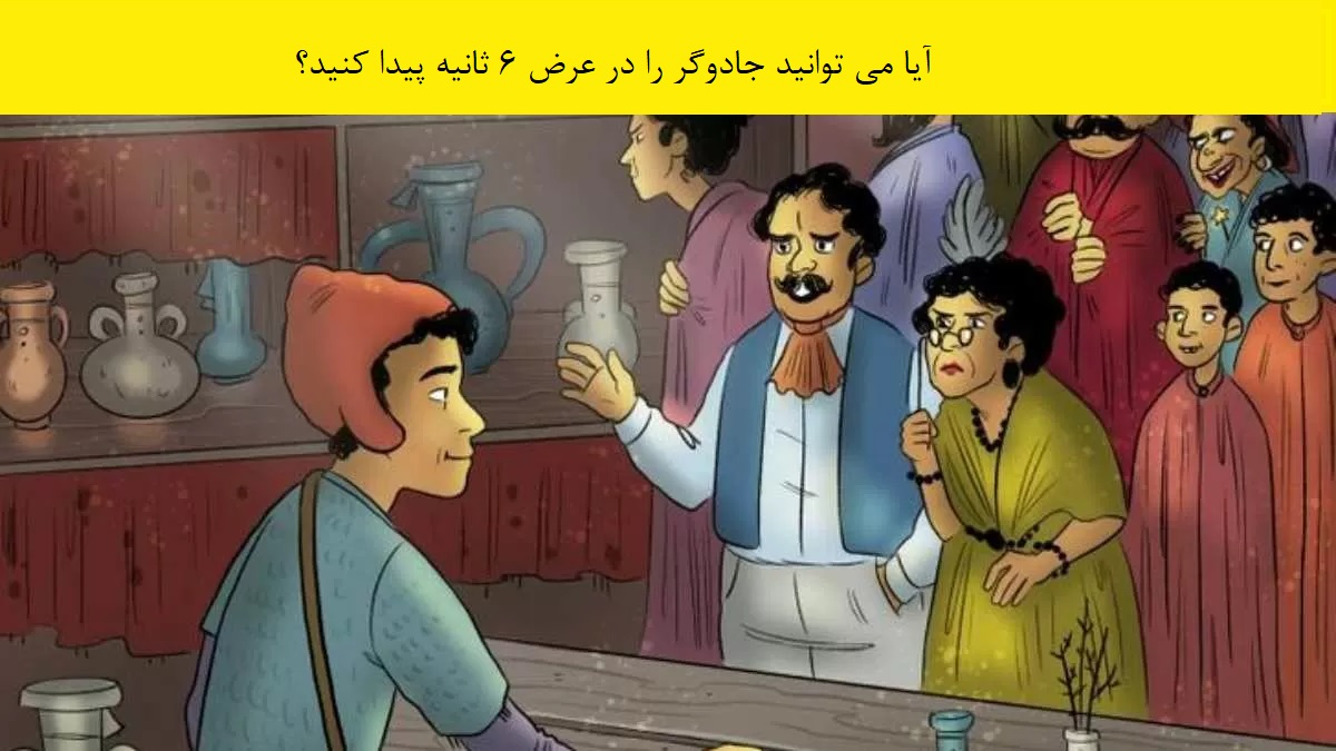 در تصویر بالا شما یک مغازه عتیقه فروشی را می بینید که افراد زیاد در این مغازه در حال دیدن گلدان های عتیقه هستن. این تصویر در نگاه اول به نظر عادی است اما در میان این افراد یک جادوگر هم است که شما باید آن جادوگر را در عرض 6 ثانیه پیدا کنید