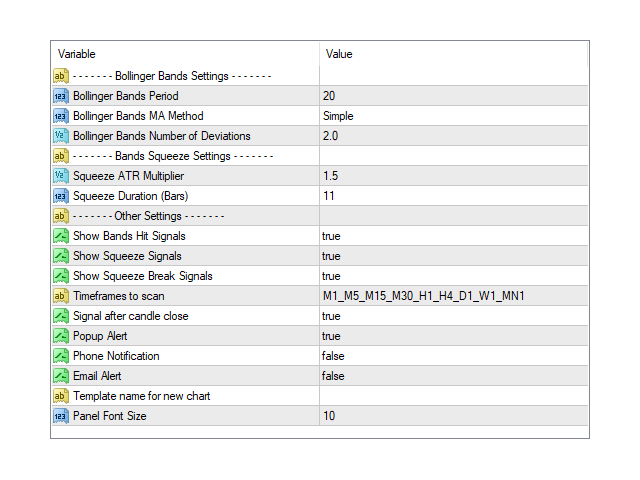 ضریب ATR را فشار دهید: این همان ضریب ATR کانال Keltner است. داشبورد فشار باندهای بولینگر (تجمیع قیمت) را در جایی که باندهای بالایی و پایینی باندهای بولینگر در خطوط کانال بالا و پایین کانال کلتنر با ضریب ATR تعریف شده قرار دارند، تشخیص می دهد. مقدار پیش فرض 1.5 ATR است. این بدان معناست که فاصله باند بالایی و خط میانی باندهای بولینگر (MA) با تعداد انحرافات 2 باید کمتر از 1.5 ATR باشد تا باندها فشرده شوند (همانطور برای باند پایین). افزایش ضریب ATR سیگنال های فشاری بیشتر اما کمتر قابل اعتمادی تولید می کند.