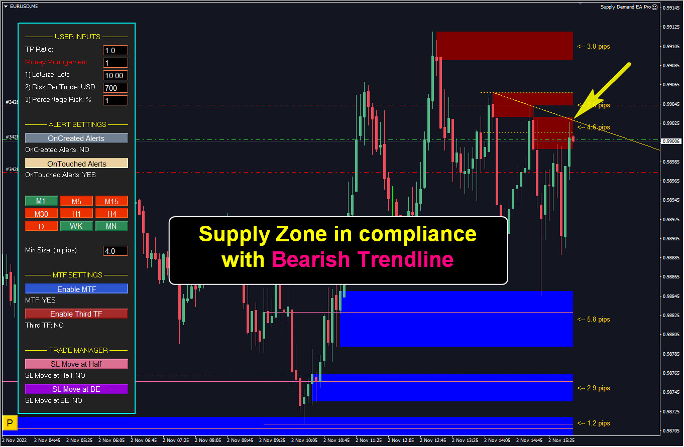 همه متنظیمات y با استفاده از “Supply Demand EA Pro” در ترکیب با نشانگر “Automated Trendlines” مشاهده شد.