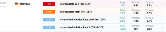 تورم آلمان در ماه سپتامبر به 10 درصد افزایش یافت و انتظارات بازار و چاپ ماه گذشته را به راحتی شکست داد. هزینه های انرژی همچنان در حال افزایش است، در حالی که سه ماه یارانه ریلی دولت آلمان در این ماه تمام شد و هزینه های حمل و نقل را بالاتر برد.