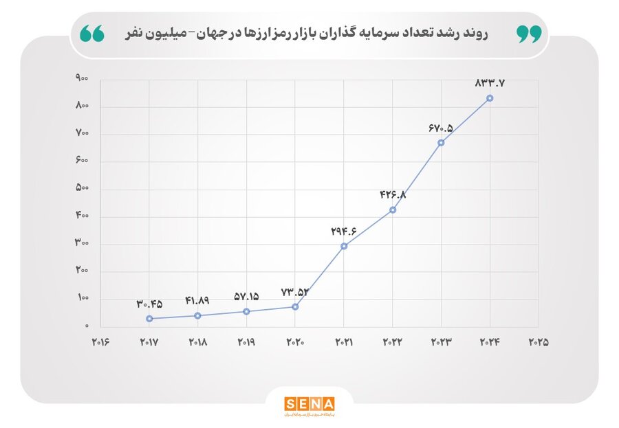 تازه ترین اطلاعات نشان می‌دهد؛ تعداد سرمایه گذاران در بازار رمز ارز ها در سال ۲۰۲۴ به مرز ۸۳۴ میلیون نفر رسید و برآورد می‌شود به زودی از مرز یک میلیارد نفر هم عبور کند.