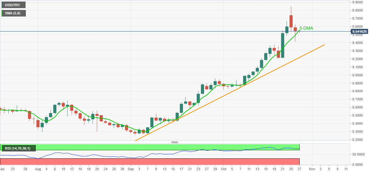 [ad_1] فروشندگان USD/TRY پس از روند نزولی دو روزه نفسی می کشند. RSI بیش از حد خرید، خرابی SMA سیگنال عقب نشینی بیشتر است. خط حمایت هفت هفته ای به چالش می کشد خرس، گاو نر بالا رکورد چشم. USD/TRY نزدیک به 9.5430-25 دلار را نشان می دهد، که شکست 5-DMA روز قبل را قبل