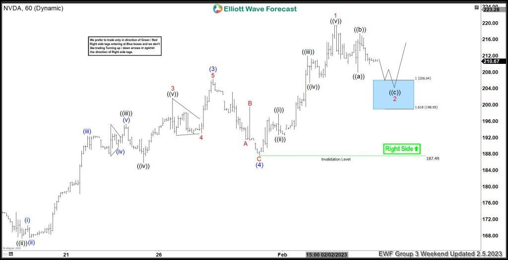 در اینجا نمودار موج 1 ساعته الیوت از بهروزرسانی آخر هفته 2/05/2023 است. که در آن، چرخه کوتاه مدت از پایین ترین سطح 1/31/2023 در موج 1 به 219.49 دلار خاتمه یافت. از آنجا به پایین، سهام در موج 2 عقب نشینی کرد تا آن چرخه را اصلاح کند. اجزای داخلی آن عقبنشینی به صورت ساختار زیگزاگ موج الیوت آشکار شد که در آن موج ((a)) به پایینترین حد 207.89 دلار خاتمه یافت. جهش موج ((b)) در بالاترین سطح 217.45 دلار به پایان رسید. و موج ((c)) توانست به ناحیه جعبه آبی در مساحت پاهای برابر 206.04-2198.85 دلار برسد.