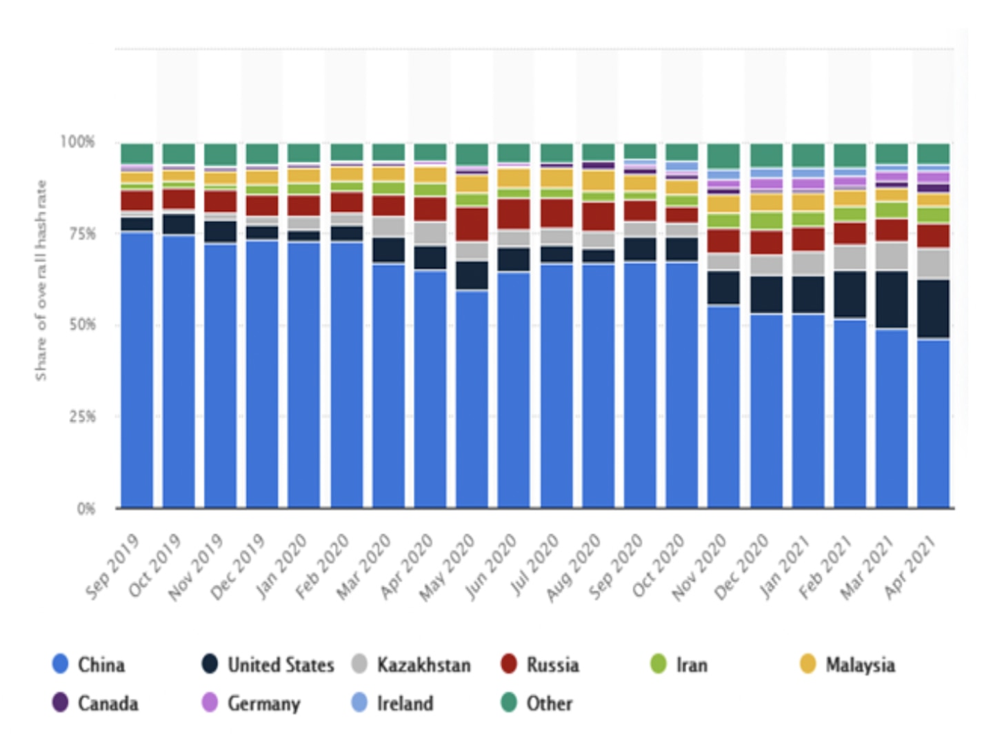 معدنچیان در ماه های منتهی به جدیدترین ممنوعیت رمزنگاری از چین فرار کرده اند. نمودار زیر مهاجرت معدنچیان رمزنگاری شده به قزاقستان ، ایالات متحده ، آرژانتین و سایر کشورها را نشان می دهد.