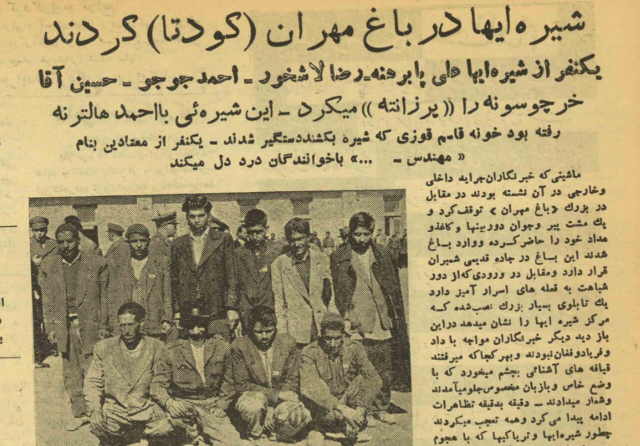 هنوز صدای داد و فریاد نخوابیده بود که «علی نوروزعلی» صف بزرگی را که بالای باغ درست شده بود شکسته و جلوی خبرنگاران آمده و گفت: «بابا ای‌والله ما که چاکریم. چرا رادیو ندارین تا من دو کلمه با ملت صحبت کنم! تو را به خدا شما به دولت بگین اگر ما بیرون بیاییم گیر شیره‌کش‌خونه نمی‌افتیم خداکند که شیره‌کش‌خونه را بسته باشن تا نفسی به‌راحتی بکشیم.» این آقا را در «باغ مهران» به نام کدخدا صدا می‌کردند و این لقب از آن‌جا به وی داده شده بود که روزی پنجاه شصت سر شیره می‌کشید و تازه با این همه مطمئن نبود که شیره‌کش‌خانه‌ها تعطیل شده‌اند و شاید از ترس آن‌ها از «باغ مهران» حاضر نبود بیرون بیاید. نوروزعلی یک‌دفعه جلو پریده و جلوی صف خبرنگاران آمده و به دادستان فرماندار نظامی گفت: «چرا آقایون را معرفی نمی‌کنین؟» و آن‌گاه با صدای بلند گفت: «فضلای قوم را پرزانته می‌کنیم: موسی، ابوالفضل، تقی، ممد خرسی، علی پابرهنه، حسین آقا خرچسونه، رضا لاشخور، محمد چهارابرو، احمد جوجو، مهدی سبیل، یوسف شله… این دفعه که برای دومین مرتبه دستگیر شده بودند و در حین کشیدن شیره مشاهده شده‌اند، به‌ جزایر جنوب تبعید خواهند شد.» قیافه‌ی این‌ها بسیار جالب بود رنگ همه‌ی آن‌ها قهوه‌ای به نظر می‌رسید و با قیافه‌های پژمرده و گردن‌های کج که گاه‌گاه چُرت هم می‌زدند زل‌زل به ما نگاه می‌کردند و گاه‌گاهی به هم می‌گفتند: «مهدی جون چه کار کنیم؟ ما رو کجا می‌برن؟ به مولا من که تقصیر نداشتم جونِ تو من با احمد هالتر رفتیم خونه قاسم قوزی که ممول را ببینیم. به خدا هفتاد روزه لب به شیره نزدم.»