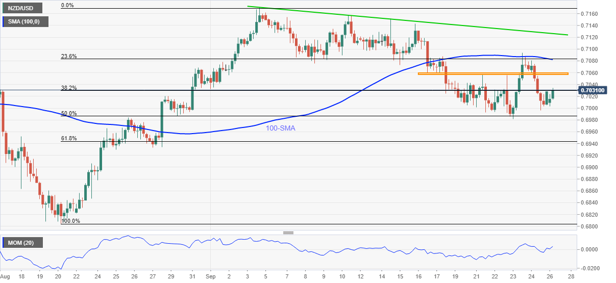 [ad_1] NZD/USD پیشنهادات خود را برای تجدید قیمت روز افزایش می دهد و ضررهای روز جمعه را تثبیت می کند. خط Firmer Momentum ، از 50٪ بازخورد فیبوناچی به نفع خریداران برگشت خورد. 100-SMA ، 23.6 moves حرکات بازیابی گارد فیبوناچی بازگردانی ، عقب نشینی ممکن است به پایین ترین سطح ماهانه برسد. NZD/USD در