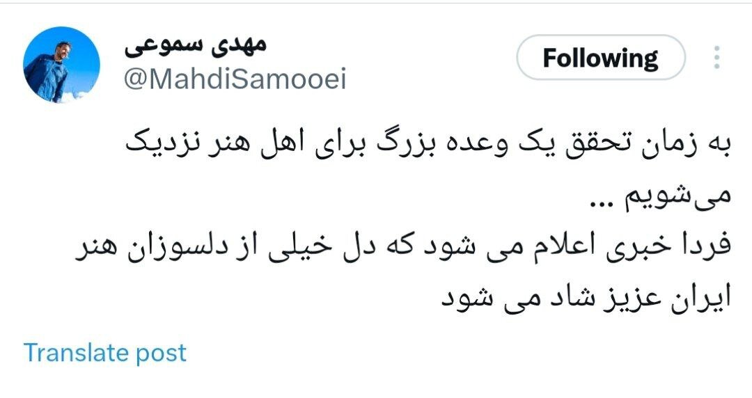 به گزارش خبرگزاری خبرآنلاین، فردا خبری اعلام می شود که دل خیلی از دلسوزان هنر ایران عزیز شاد می شود.