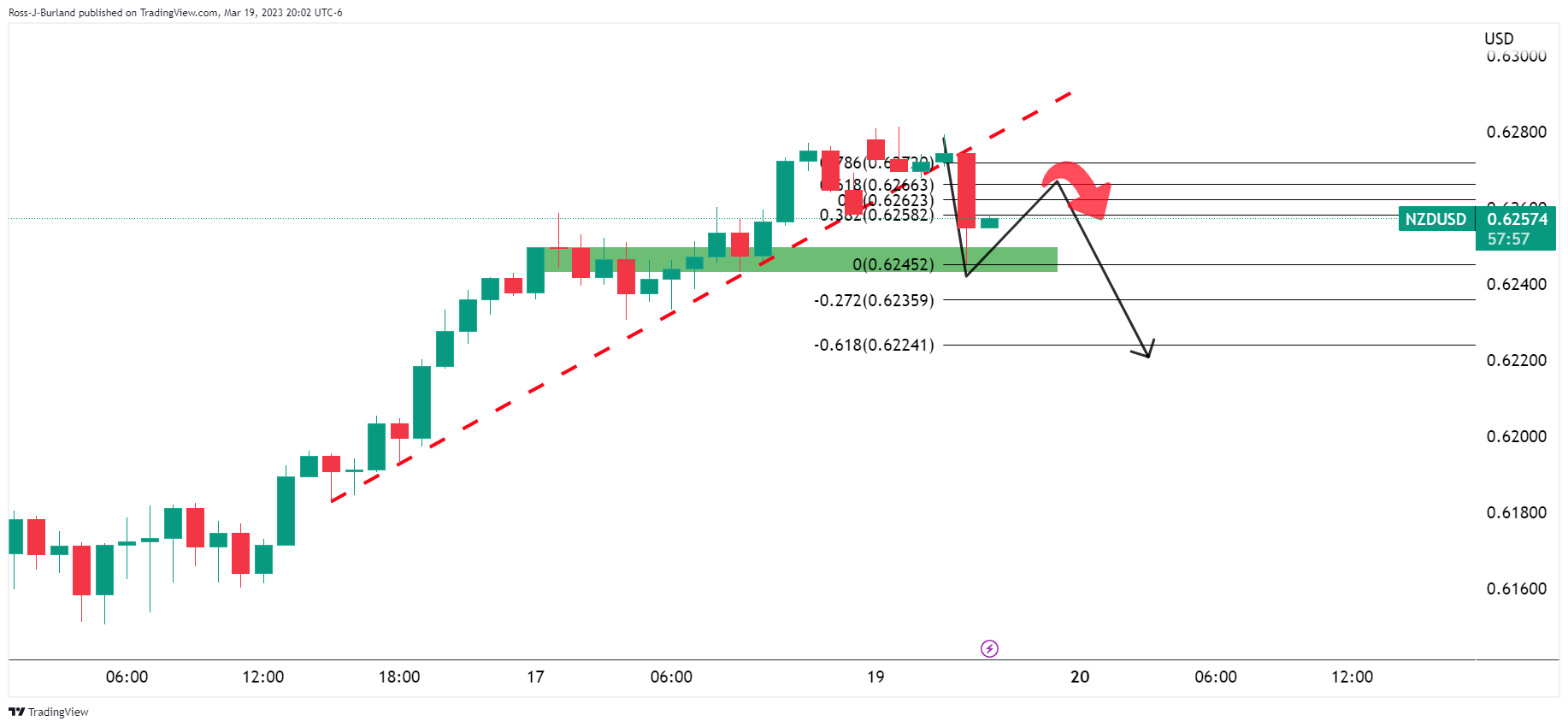 NZD/USD در حالی که خرسها از بالاترین سطح جلسه نزدیک به 0.6280 حرکت میکنند، به منطقه حمایت قبلی در نمودارهای ساعتی رسیده است. NZD/USD تاکنون بین 0.6245 حرکت کرده است.