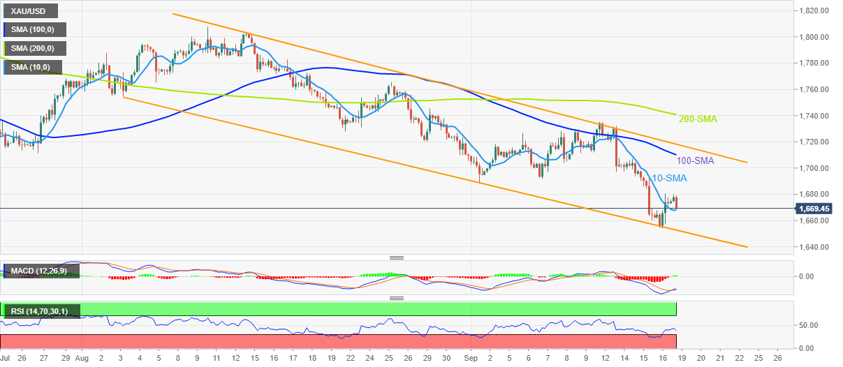 قیمت طلا در کانال نزولی شش هفتهای باقی میماند و اخیراً سطوح پایینتری را حفظ کرده است. با انجام این کار، XAU/USD همچنین شکست صعودی روز قبل 10-SMA را که حدود 1668 دلار در زمان چاپ بود، معکوس کرد.