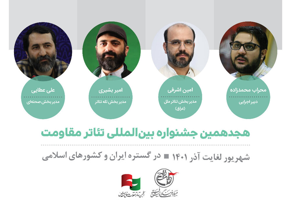 به گزارش خبرگزاری خبرآنلاین، سید وحید فخر موسوی دبیر هجدهمین جشنواره بینالمللی تئاتر مقاومت طی احکامی جداگانهای، محراب محمدزاده را بهعنوان دبیر اجرایی، امین اشرفی را به عنوان مدیر بخش ملل عراق، علی عطایی پیرکوه را به عنوان مدیر بخش صحنهای و امیر بشیری را به عنوان مدیر بخش تلهتئاتر منصوب کرد.