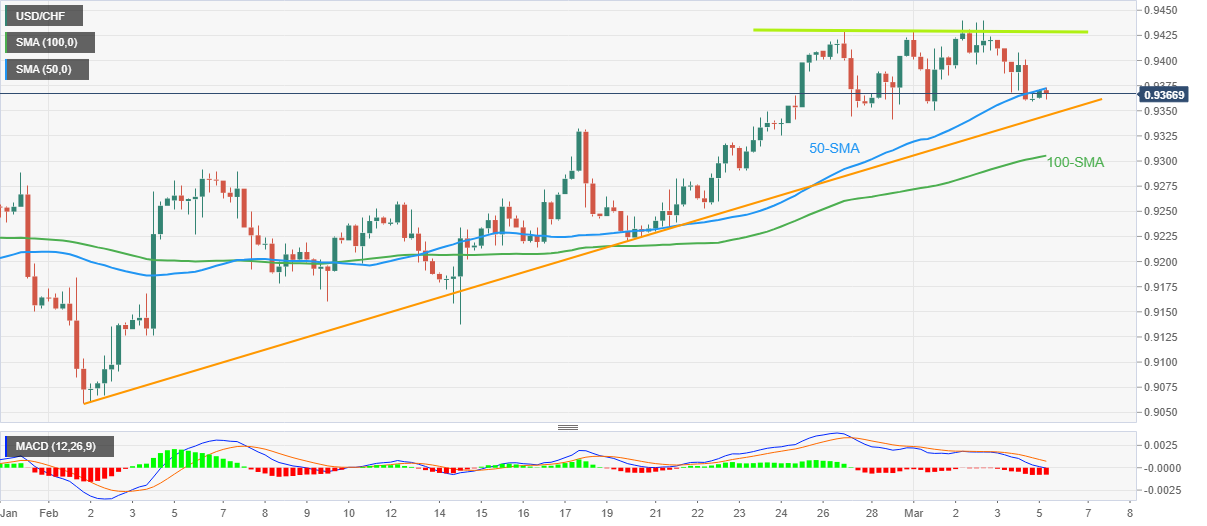 جدا از احتیاط پیش از داده، سیگنال های MACD نزولی و مقاومت افقی یک هفته ای نزدیک به 0.9430 نیز خریداران USD/CHF را به چالش می کشند.