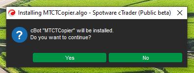 2. ابتدا cTrader را راه اندازی کنید و سپس روی این فایل MTTCopier.algo دوبار کلیک کنید. cTrader یک پنجره نصب را مانند زیر درخواست می کند. روی “بله” کلیک کنید.