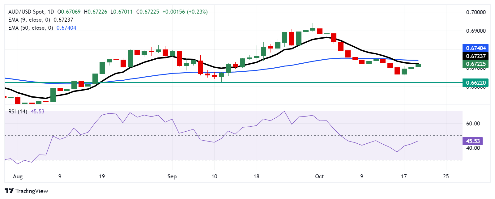 جفت AUD/USD در روز دوشنبه حدود 0.6720 معامله می شود. تجزیه و تحلیل فنی نمودار روزانه نشان می دهد که این جفت در زیر میانگین متحرک نمایی 9 روزه (EMA) قرار دارد که نشان دهنده یک سوگیری نزولی کوتاه مدت است. علاوه بر این، شاخص قدرت نسبی 14 روزه (RSI) زیر 50 باقی می ماند و احساسات نزولی غالب را تأیید می کند.
