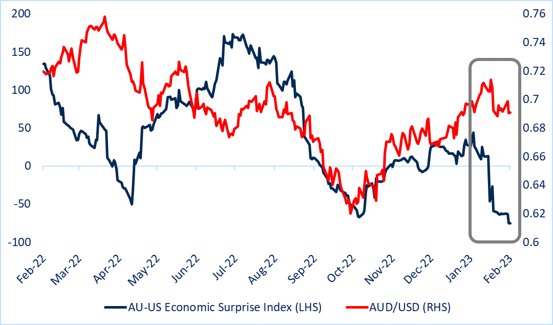 AUD/USD که از ابتدای این ماه تقریباً 4 درصد کاهش یافته است، ناشی از عملکرد ضعیف نسبی اقتصاد استرالیا است که در شاخص های شگفتی اقتصادی (ESI) منعکس شده است. ESI استرالیا در حول و حوش پایین ترین سطح 2020 فرو می نشیند، در حالی که همتای آمریکایی آن در بالاترین سطح در 10 ماه گذشته قرار دارد. دادههای بهتر از حد انتظار ایالات متحده اخیراً به ارتقای حاشیهای در انتظارات رشد اقتصادی ایالات متحده برای سال 2023 تبدیل شده است. در مقابل، چشمانداز رشد اقتصادی استرالیا برای سال جاری هنوز شاهد ارتقاء نیست.