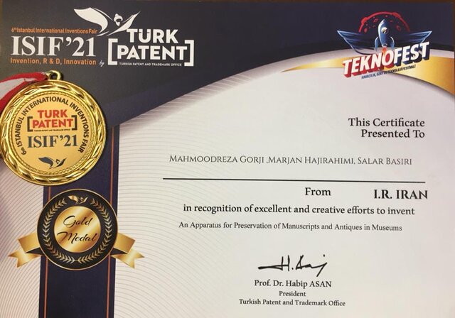 به گزارش ایسنا، نمایشگاه اختراعات ترکیه با رقابت ۲۶۰ اختراع از ۲۰ کشور برگزار شد که گروه ایران با اختراع دستگاهی برای حفاظت از اشیای تاریخی و هوشمندسازی موزه‌ها، از این نمایشگاه مدال طلا دریافت کرد. محمودرضا گرجی، مرجان حاجی رحیمی و سالار بصیری قبلا از نخستین دوره مسابقات بین‌المللی اختراعات سوئیس (ویژه مخترعان عضو فدراسیون جهانی ایفیا) مدال طلا کسب کرده بودند.